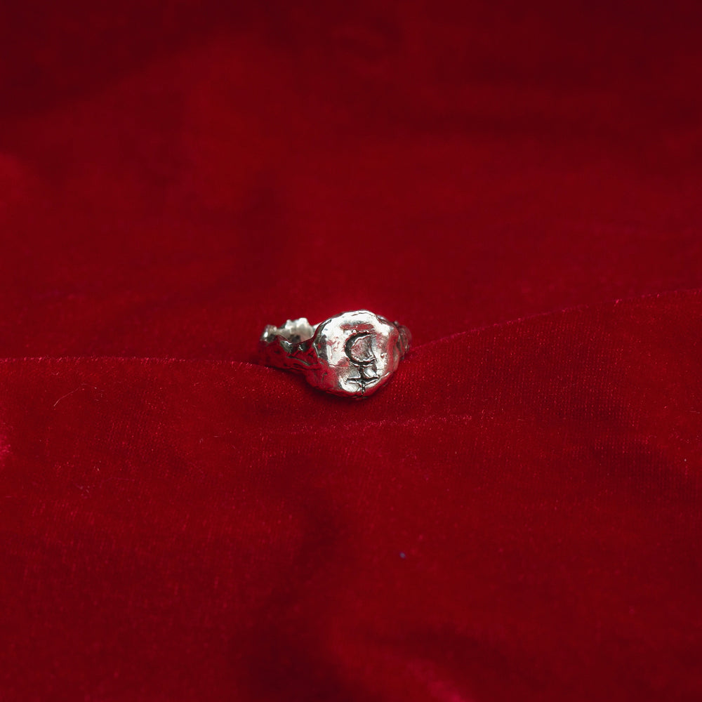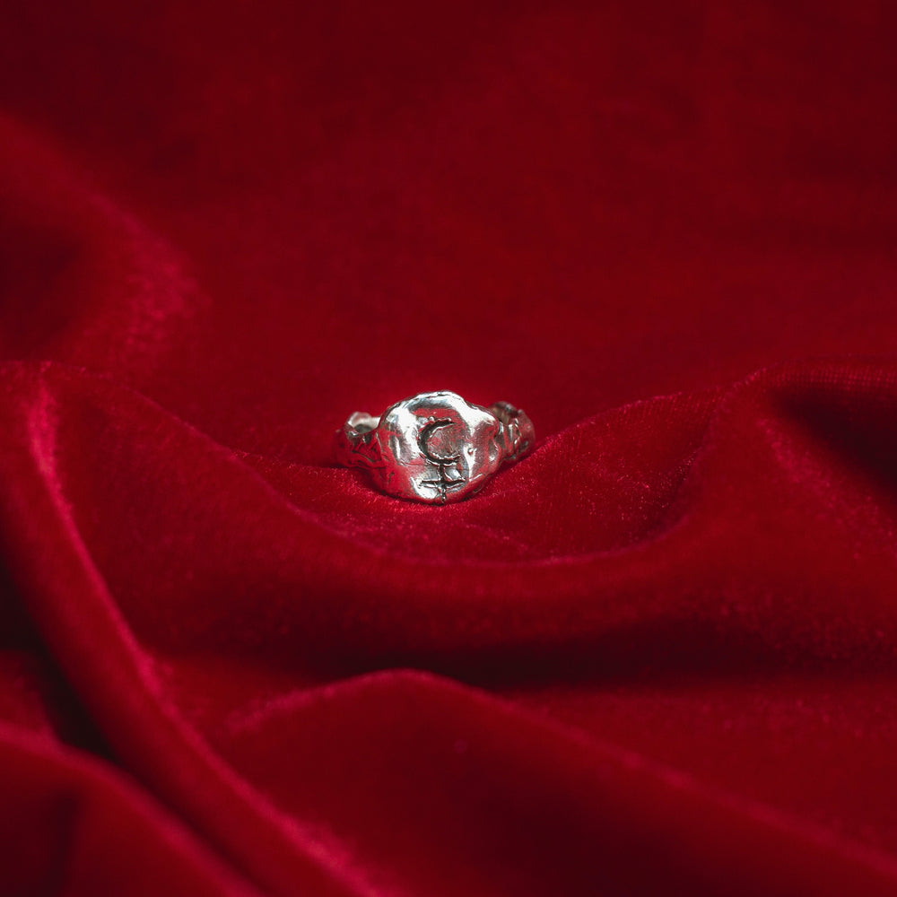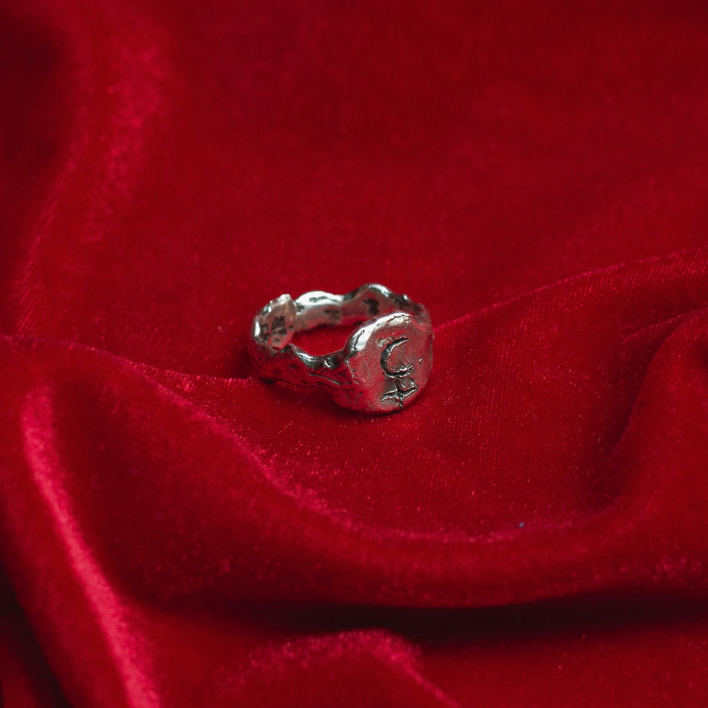 O Anel LILITH é uma joia simbólica feita à mão em prata 925 maciça, inspirada no mito de Lilith, figura arquetípica que representa liberdade, desejo e poder pessoal.